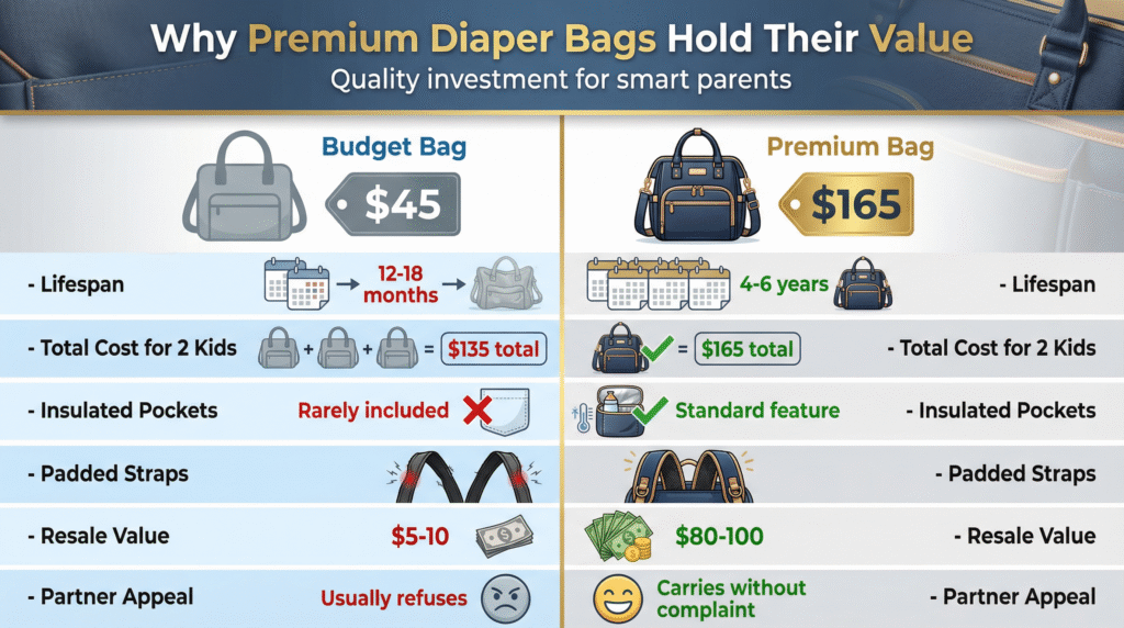 Resale value recovers your investment. Premium diaper bags hold their value on the used market. A $180 bag sells for $80-100 when you’re done with it.