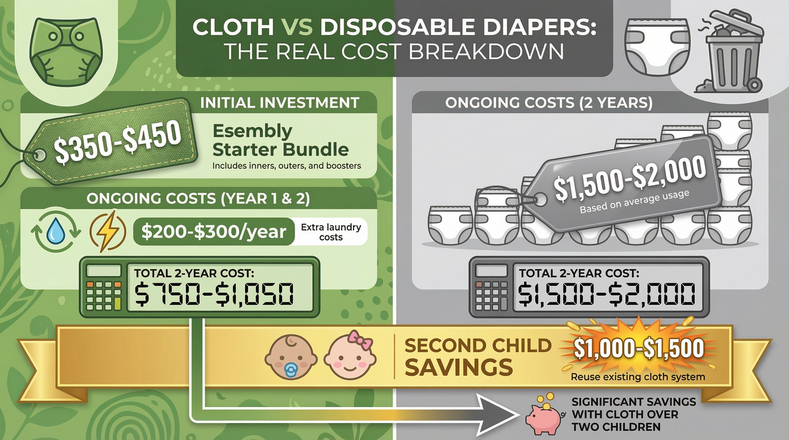 An Esembly starter bundle costs several hundred dollars upfront. Disposable diapers run between $500 and $2,000 more per child over two years.