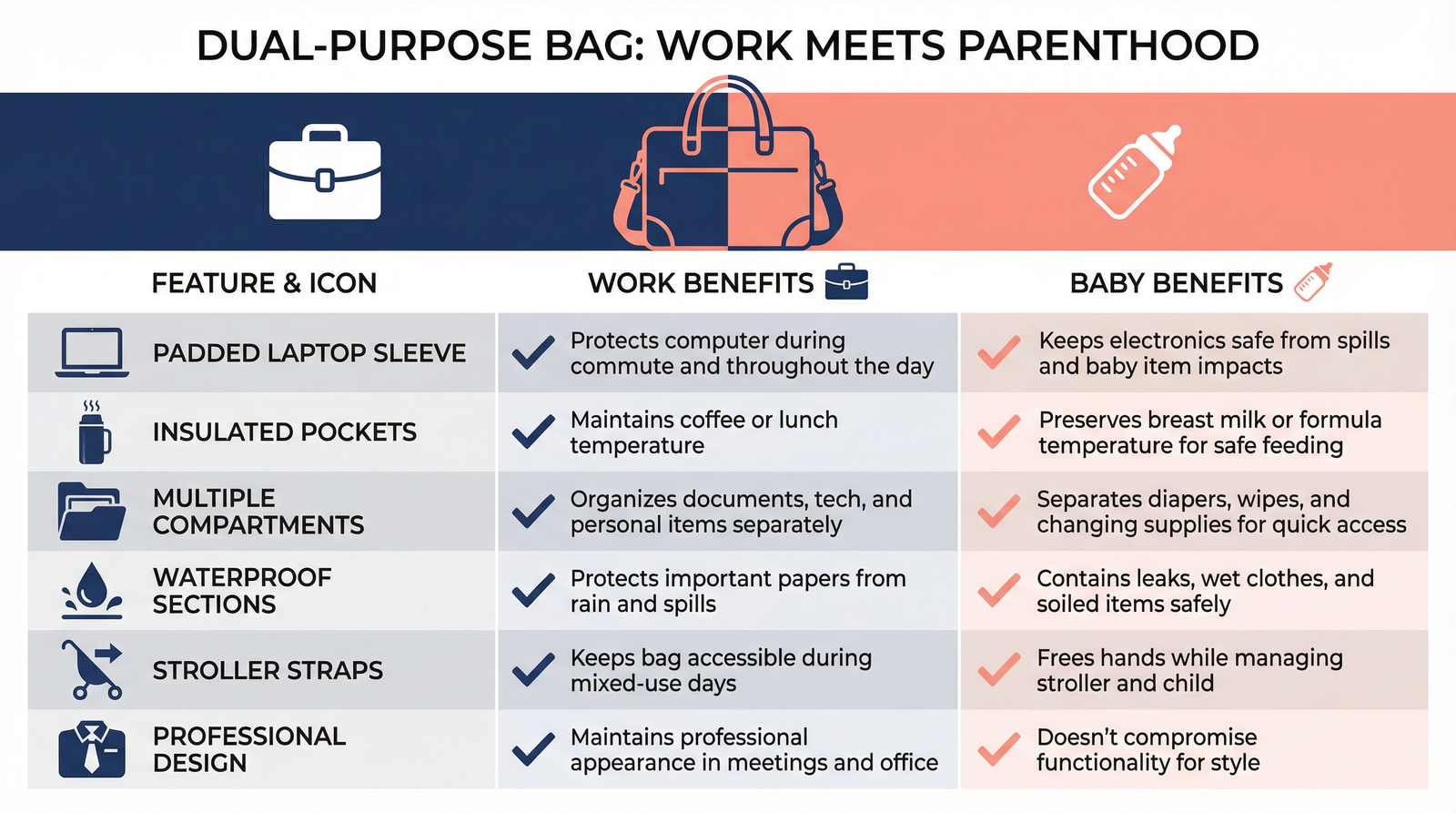 A versatile diaper bag uses smart compartmentalization. Your work documents need their own space away from potential leaks.